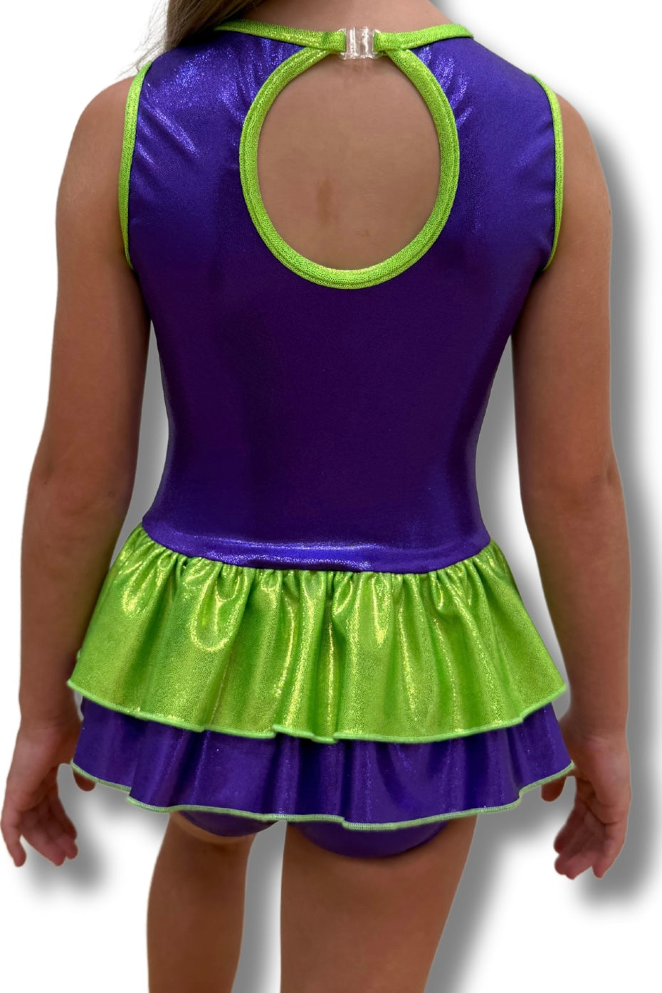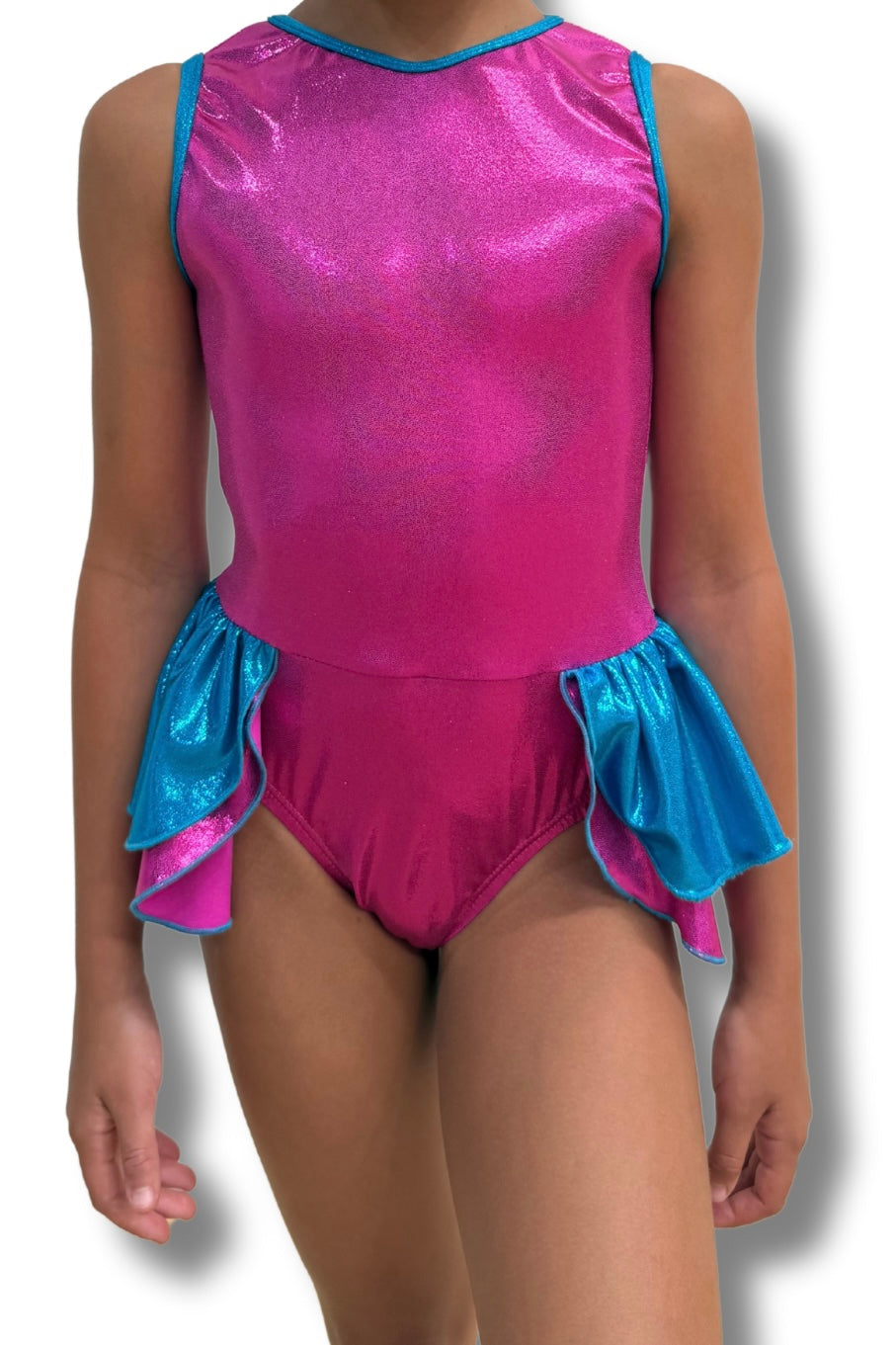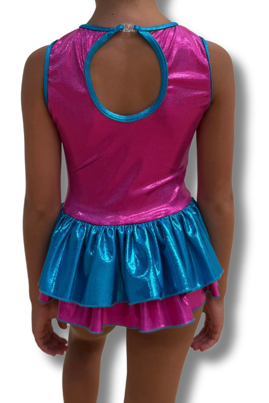 This costume is such a cute one, available in child sizes only, it features a high neck secured with a bikini clip at the back, and a two layer frill skirt, each frill will be the opposite colour, this costume is currently available in Pink and Blue, and Purple and Green.