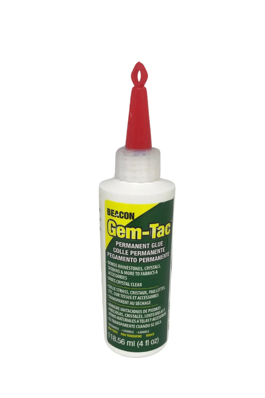 Gem-tac is a permanent adhesive, it bonds gems, sequins, glitter and rhinestones to fabric. It can also bond fabric to glass, vinyl, metal, and patent leather. This glue is a great multi-purpose adhesive, washable and dries clear it is non-toxic and non-flammable.