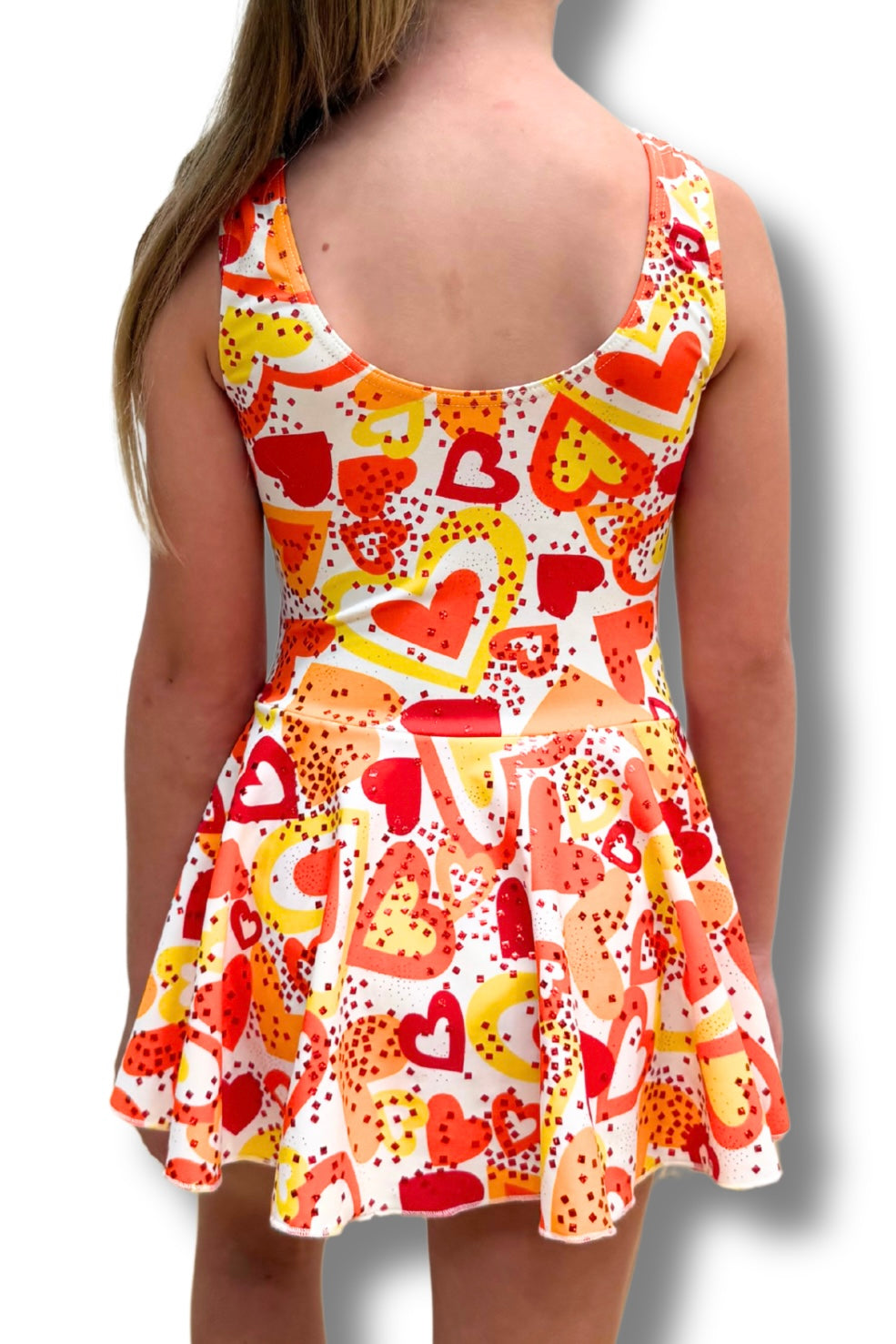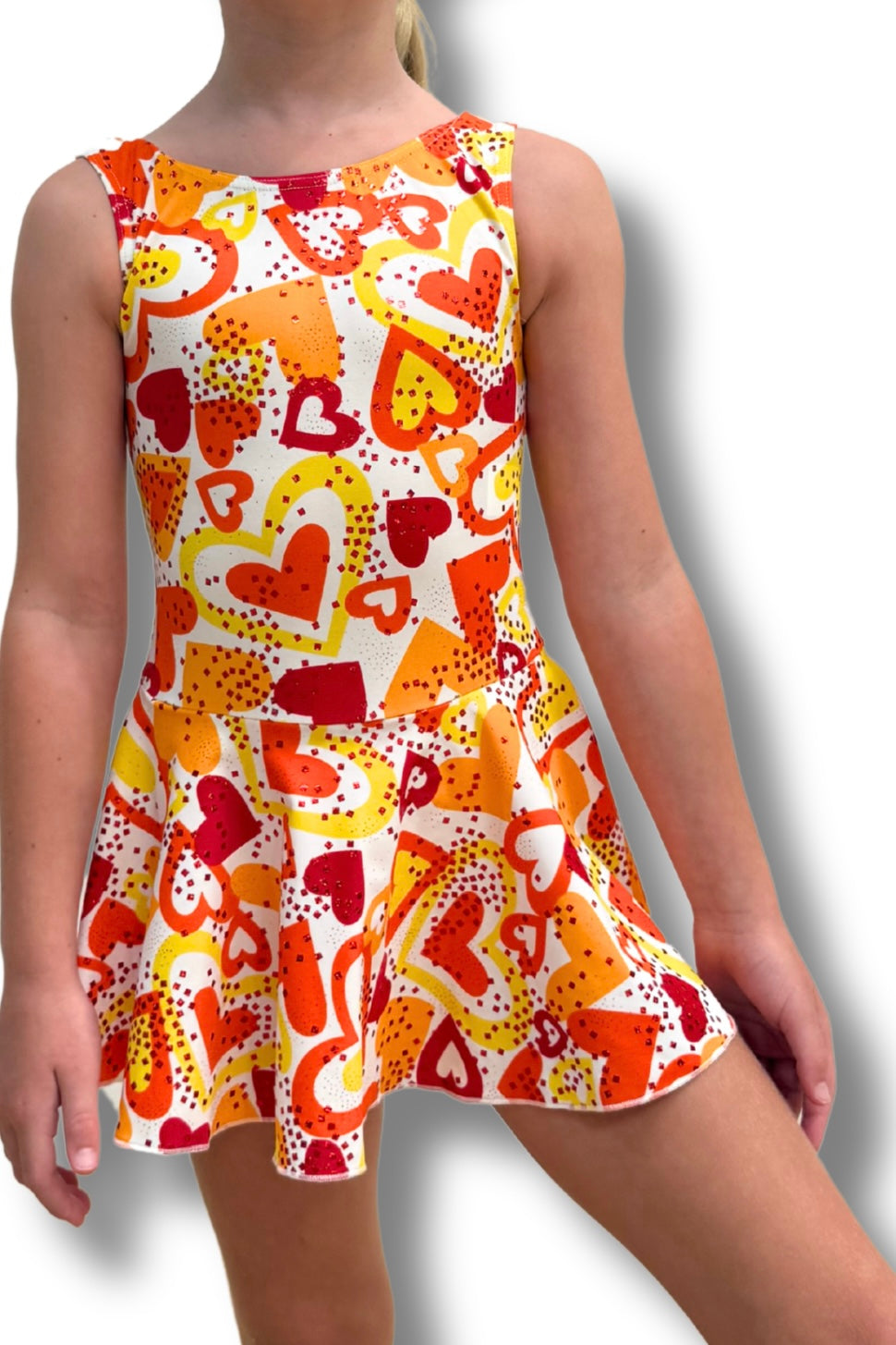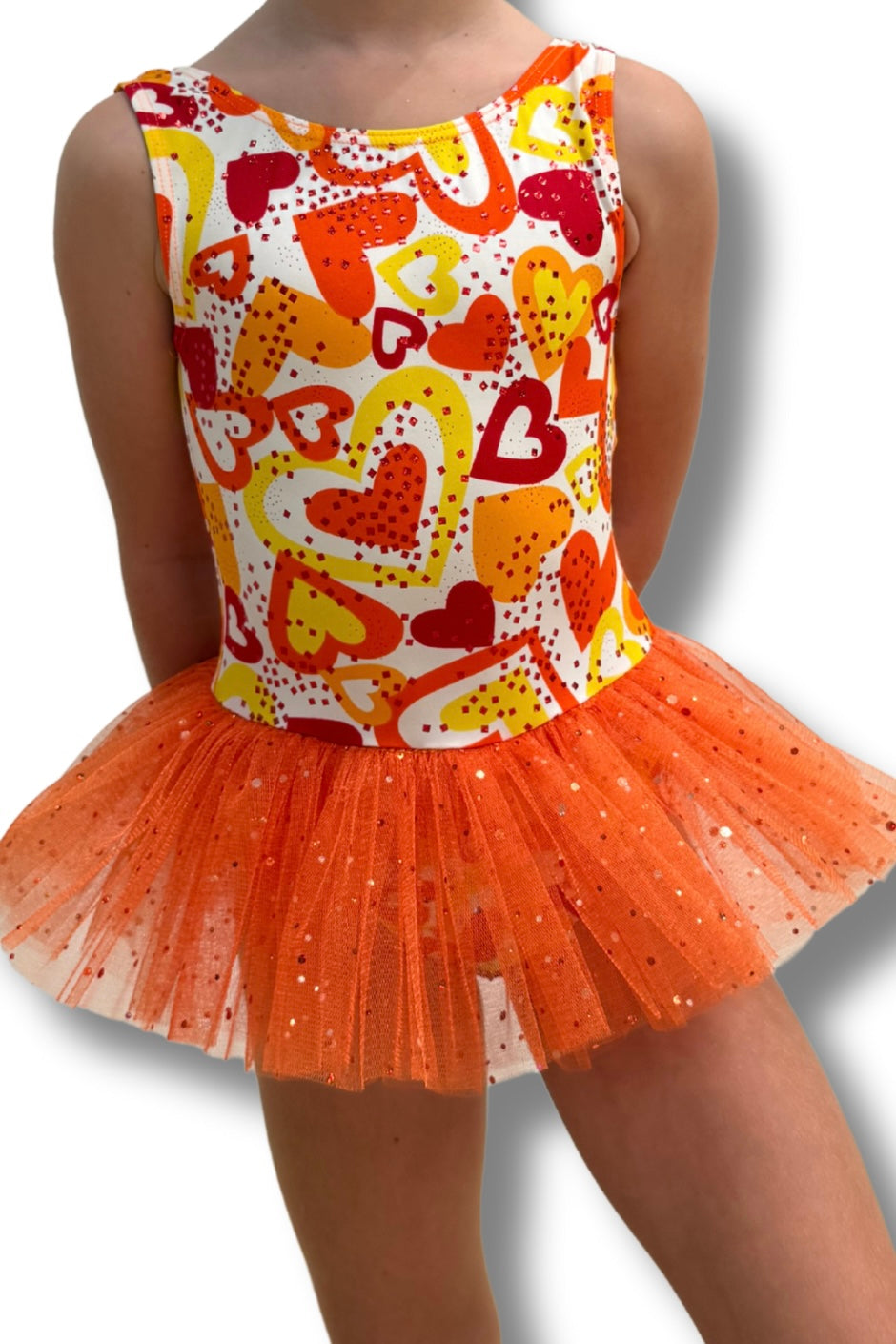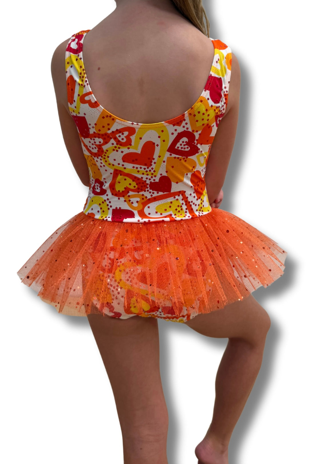 This costume is a basic Leo with a full circle skirt, it is made in a beautiful hearts fabric, you can have the choice out of the hearts fabric for the skirt or glitter tulle.