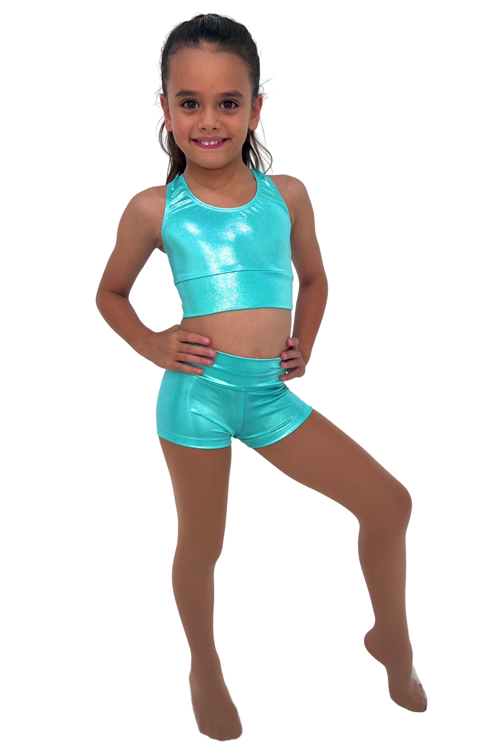 Mia is wearing girls size 4 in the aqua pearl Kylie sparkle shorts, paired with the Stephanie sparkle crop to create the look.