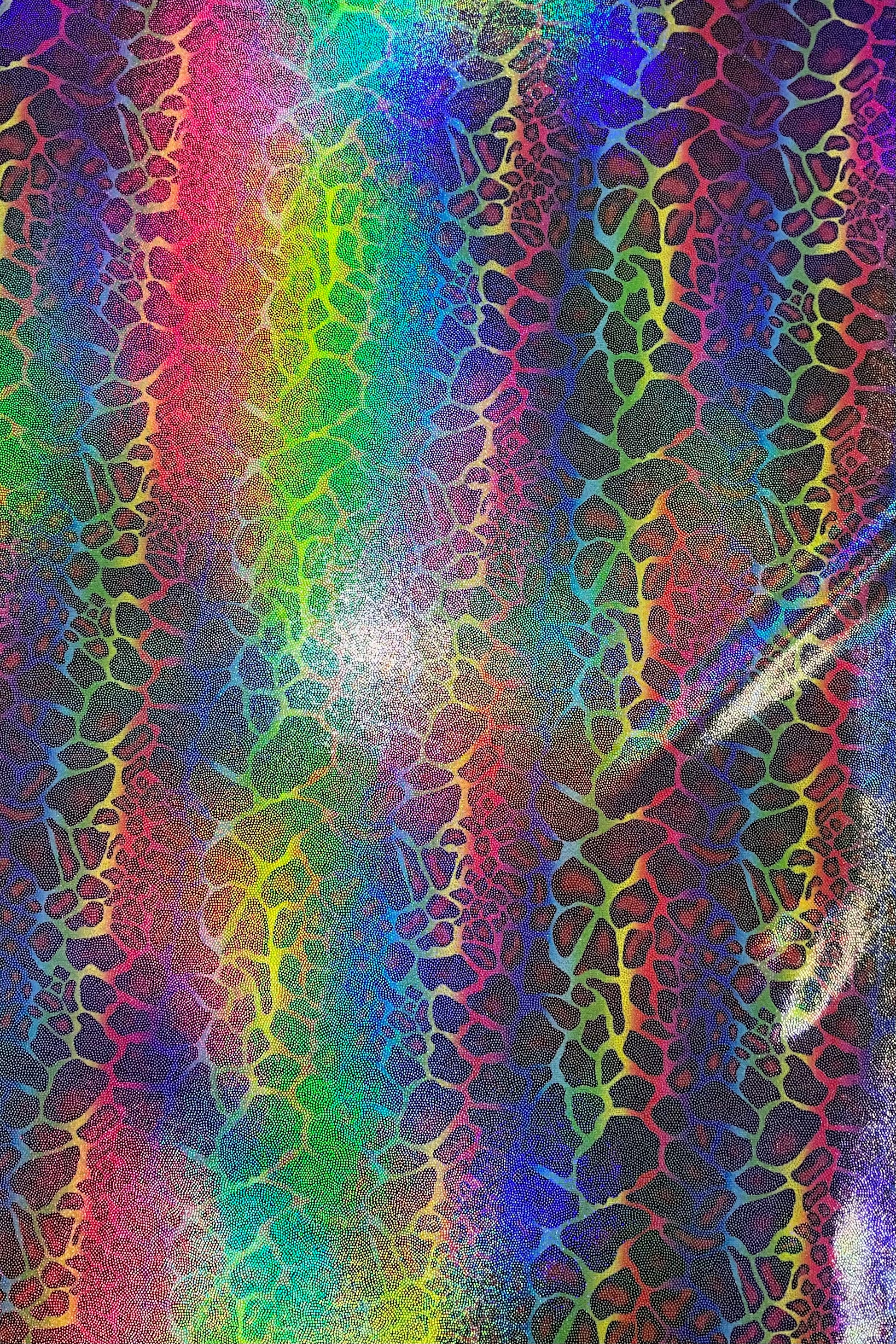 Stay comfortable and stylish with our Mirror Bam Bam! Made with a delightful 2 way stretch Lycra, this fabric boasts a vibrant rainbow foil animal print perfect for dance, gymnastics, and activewear. Stretch and shine in our latest must-have.