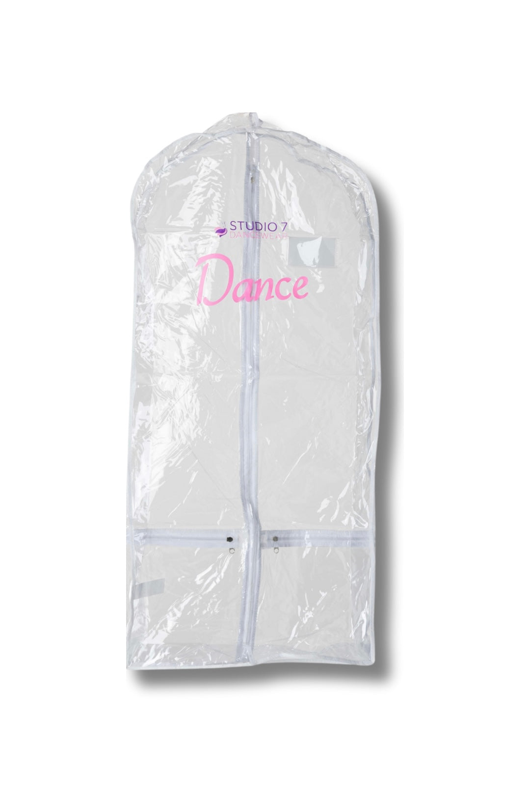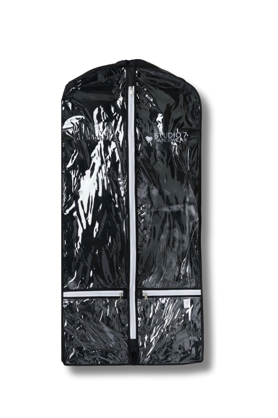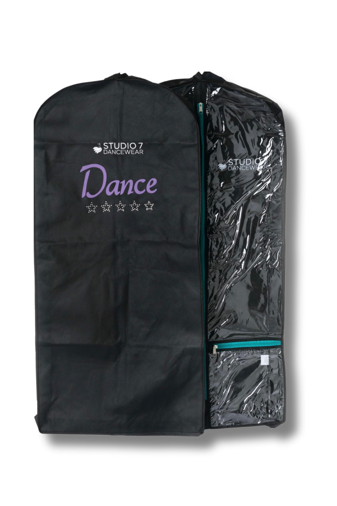 Transport your dance costumes and accessories in style with our Short Garment Bag- Studio 7. With 2 zipped pockets for convenience, keep your items safe and organized. Available in black or clear with our logo, upgrade to the premium version featuring dazzling diamante detailing. L: 103cm | W: 50cm