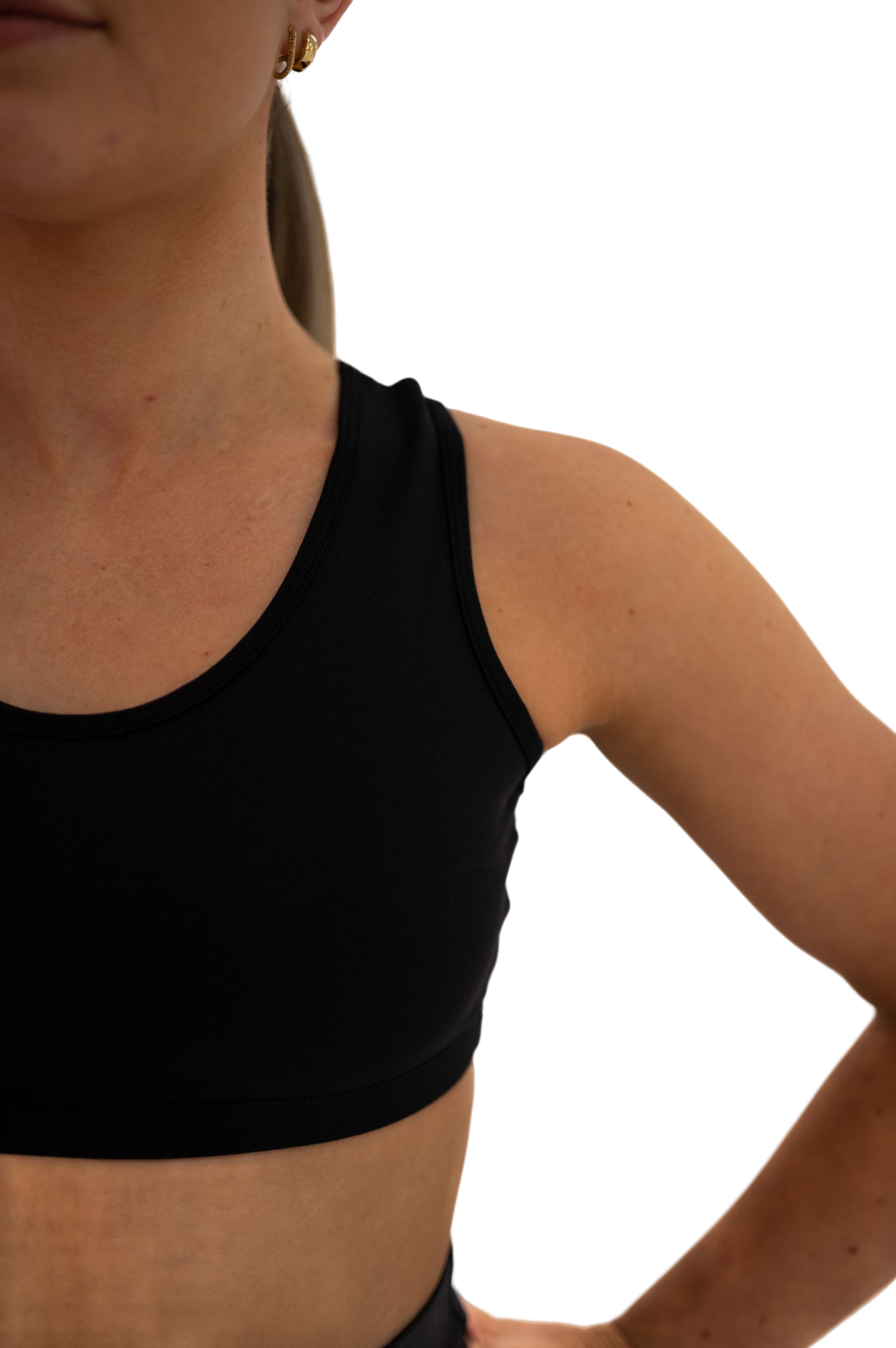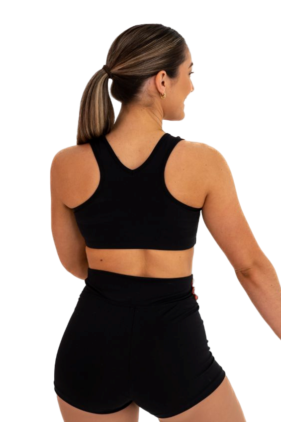 Our supportive, sports-bacl croptop features thin bind that is elasticated around the neckline to finish off the look. A perfect style for the studio or to stand-out in an improv!