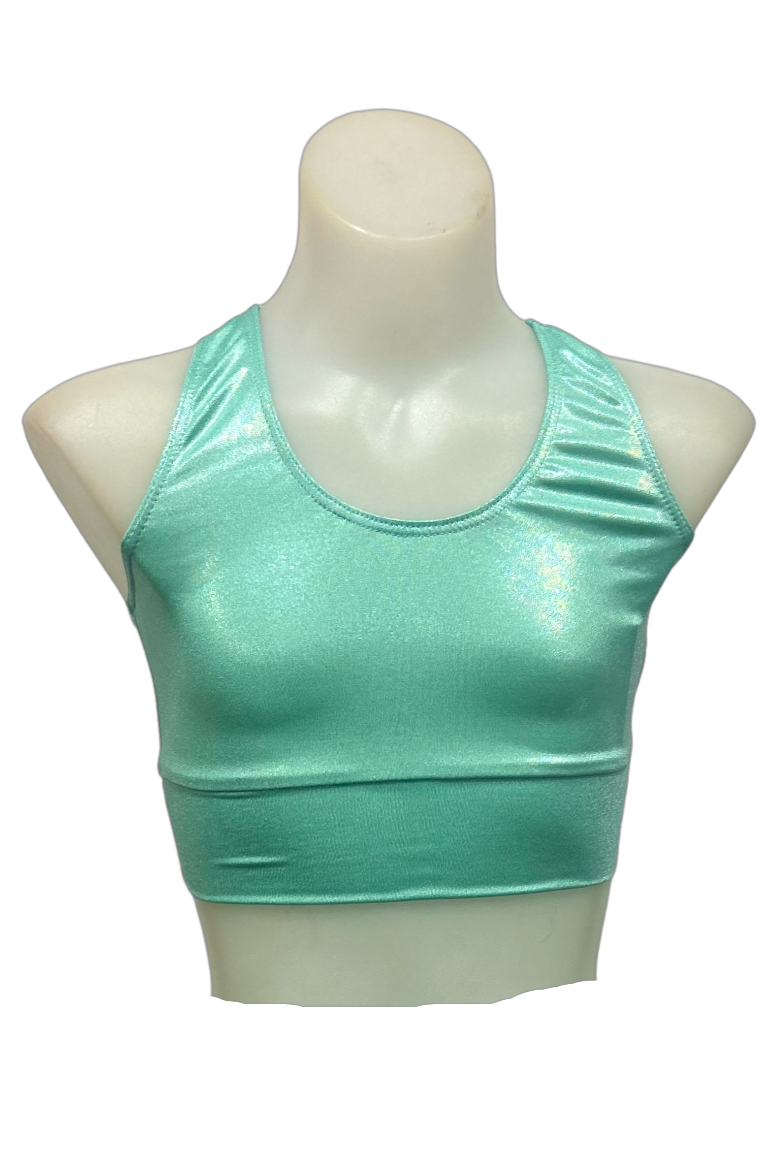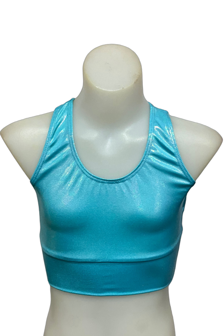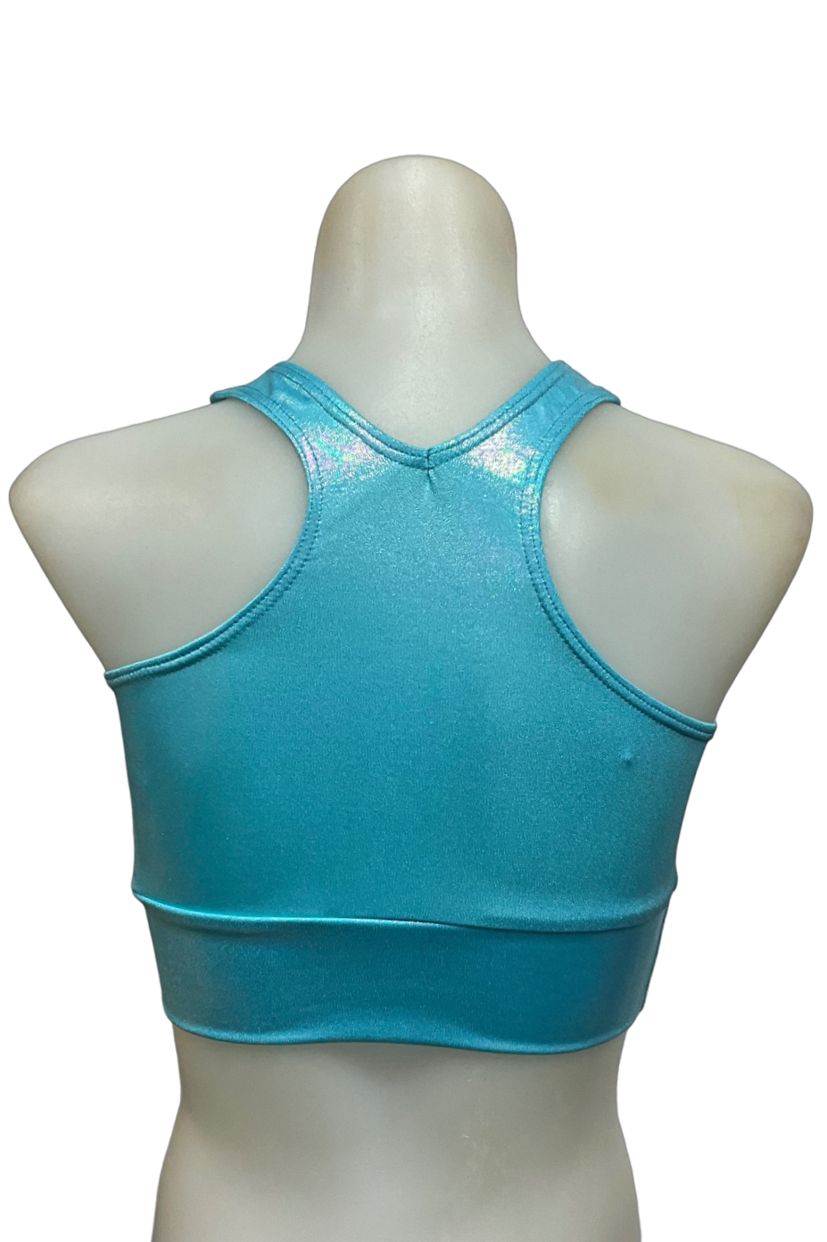Mia is wearing girls size 4 in the aqua pearl Stephanie crop paired with the Kylie sparkle shorts to create the look.