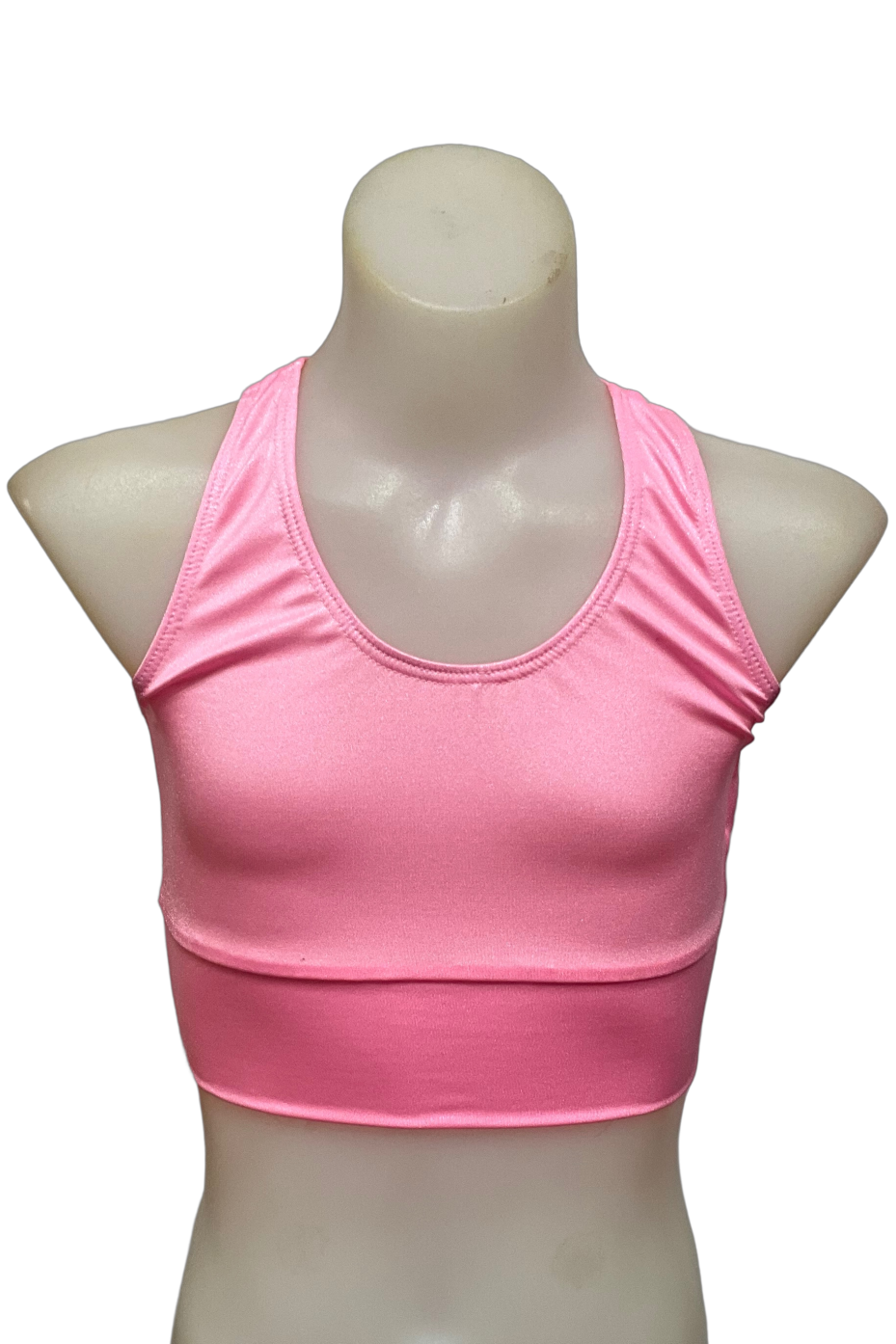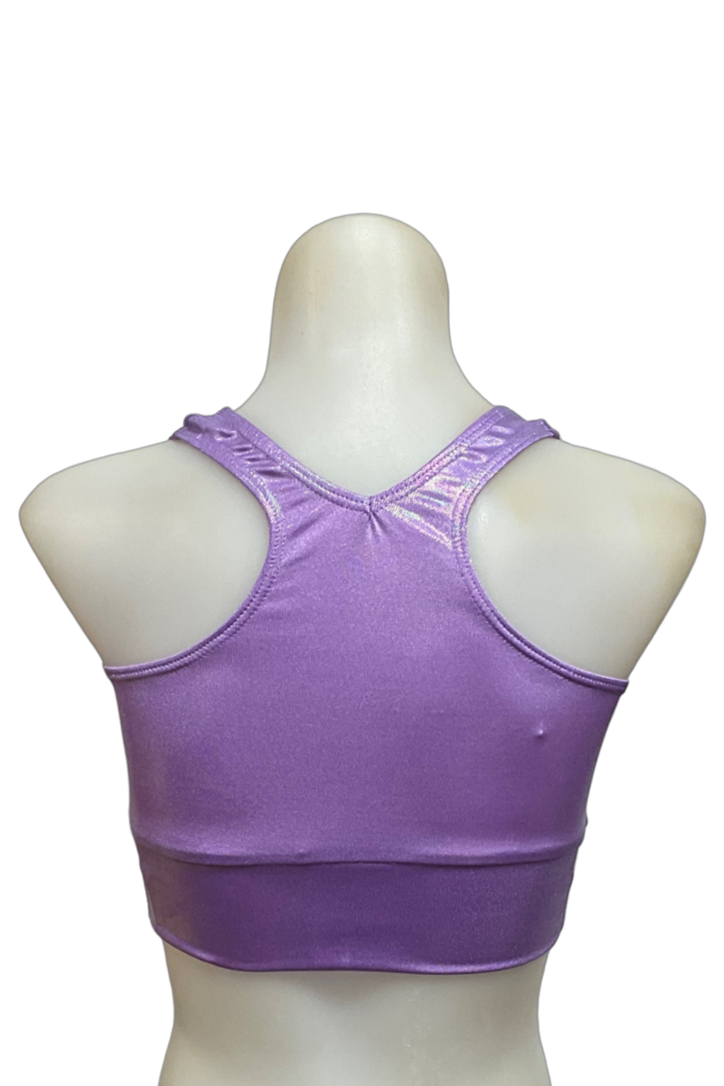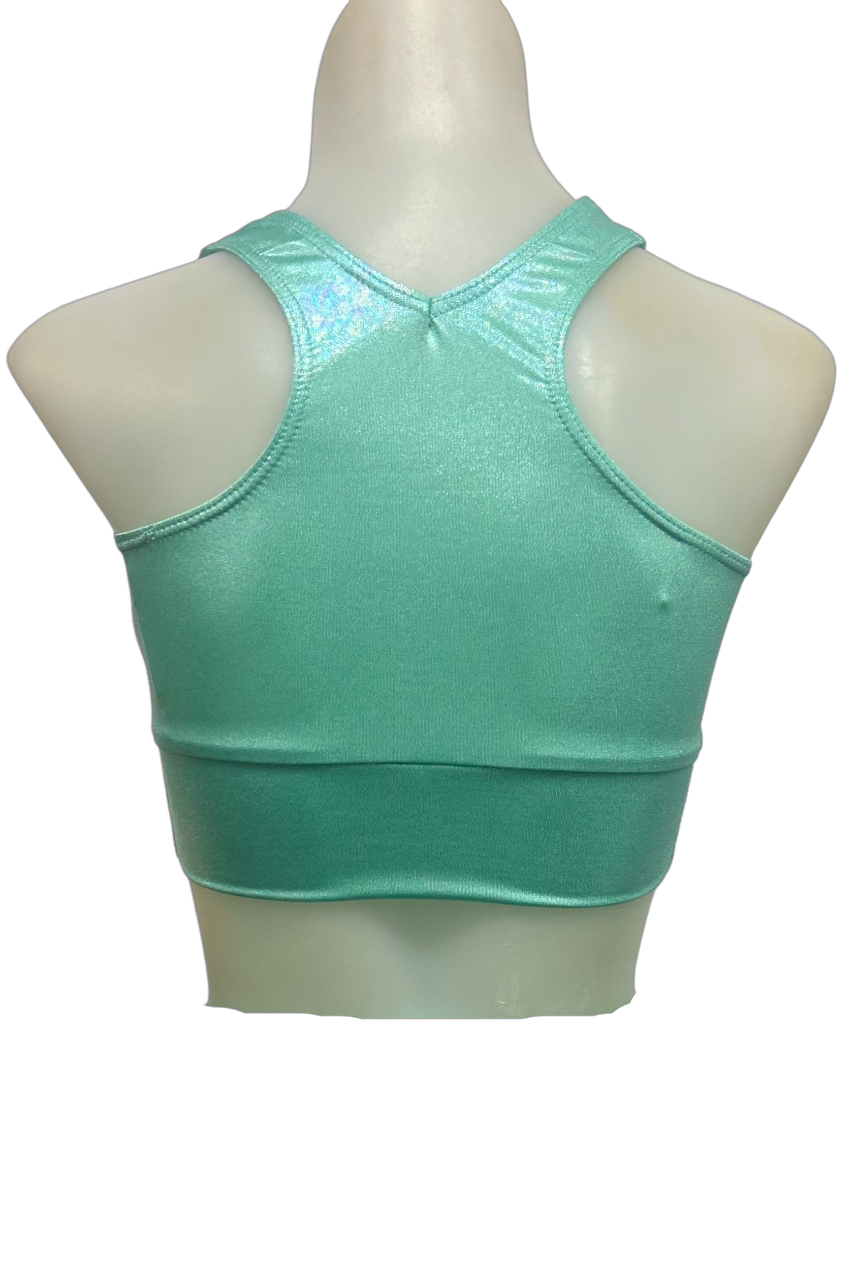 Mia is wearing girls size 4 in the aqua pearl Stephanie crop paired with the Kylie sparkle shorts to create the look.
