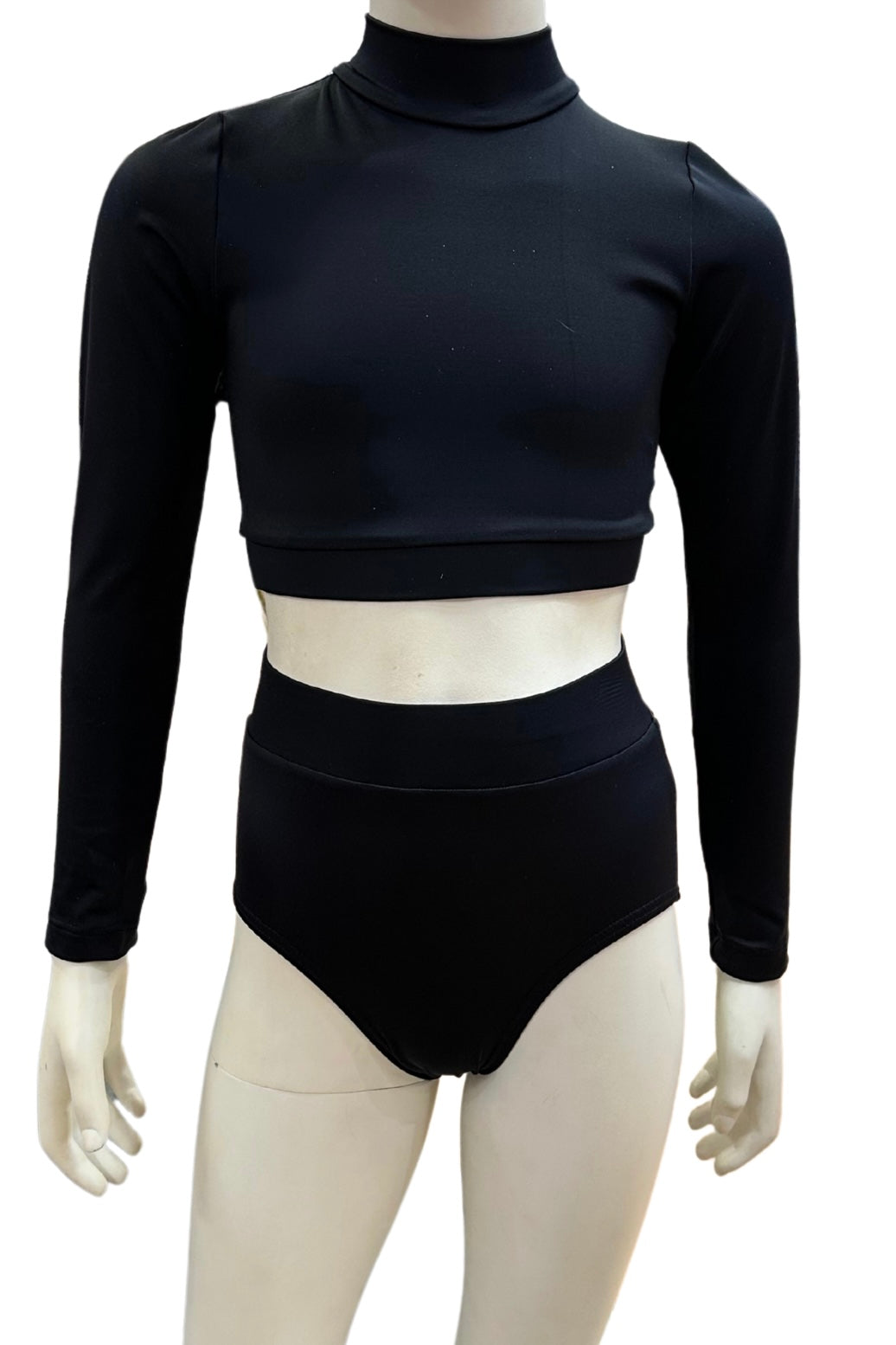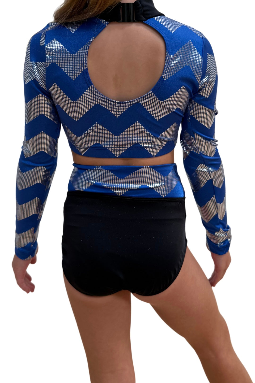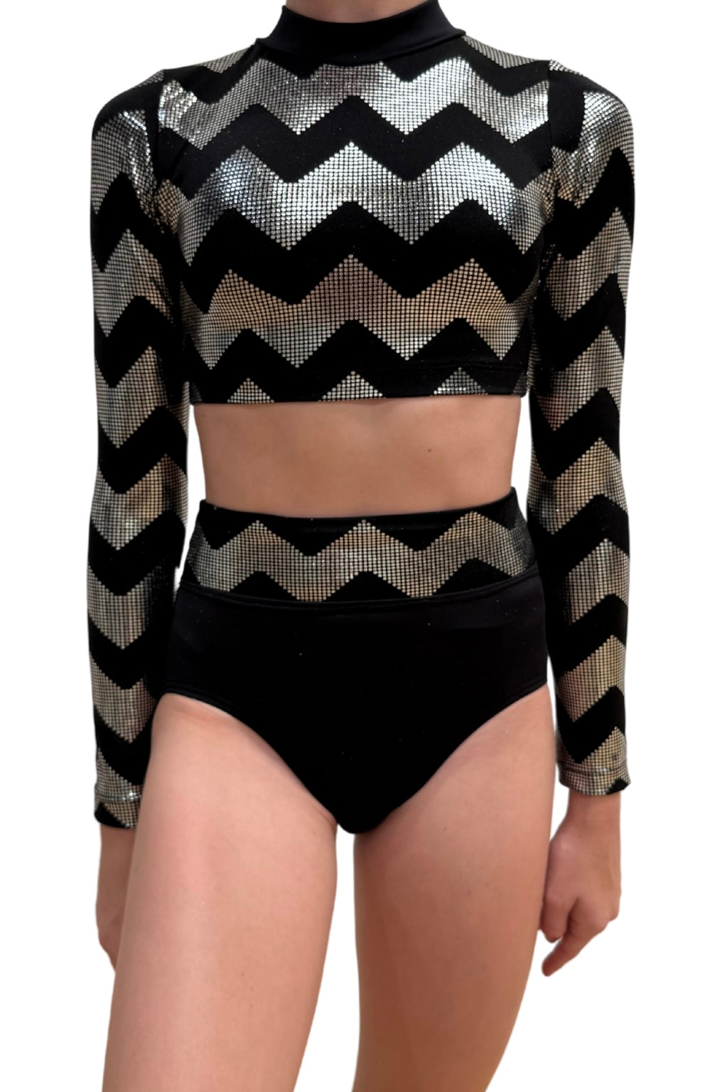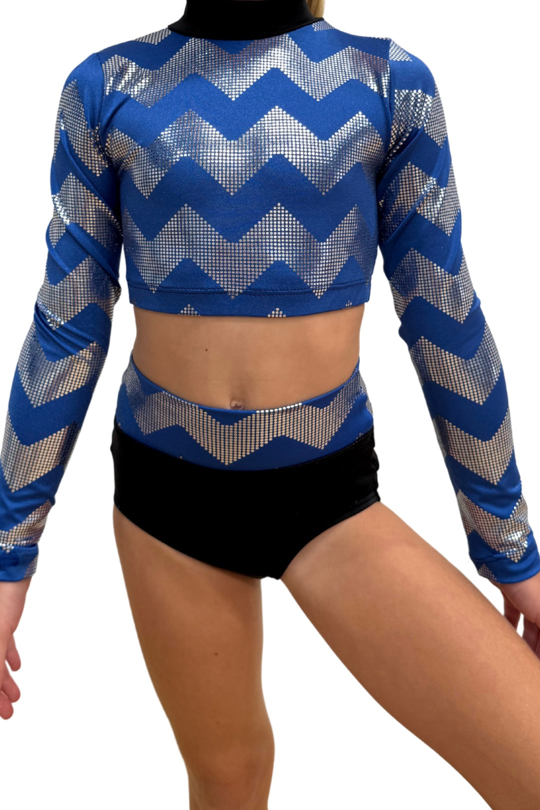 This costume comes in a set, it includes a high neck long sleeve crop and a high waisted knicker featuring the zig zag fabric, this costume is available to order in black/silver, blue/silver or plain black.